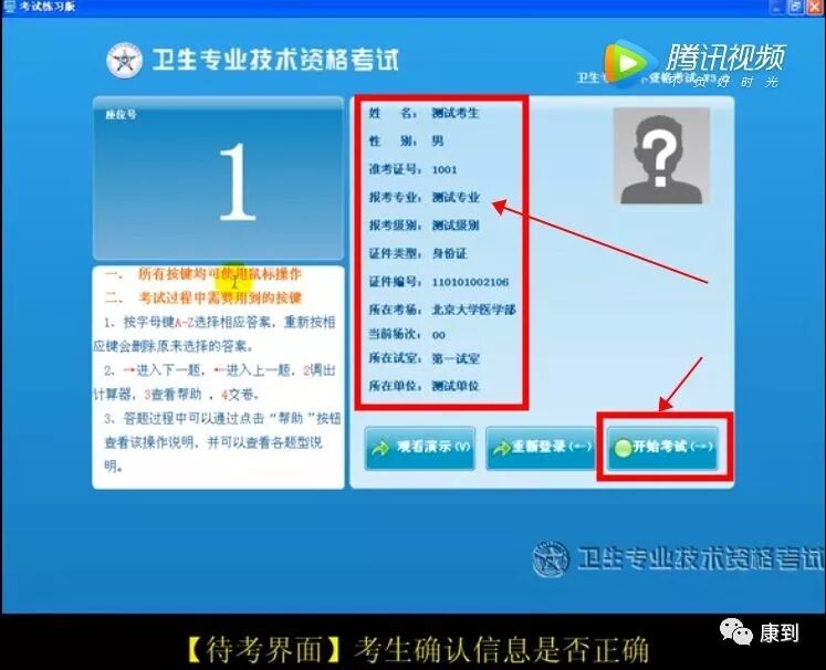 第二步:【待考界面】考生确认信息是否无误,确认后点击“开始考试”,进入答题界面;